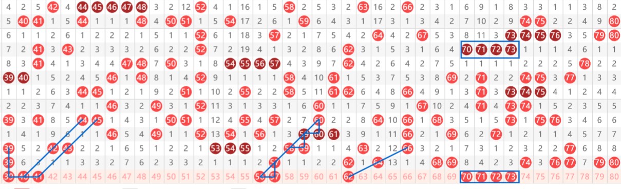 【第二区间41-80】:上期开出10个号码。本期推荐:41-56-57-62-70-71-72-73八个号码。41等距斜连对子号,为常见形态;56-57为形态号码,在5字头,这种形态非常热;62偶数斜连,它本身为重号常见形态;70-71-72-73大四连,上下对称形态,70、73为斜连号码、71-72同路号码,又是中间对子,大家根据自己方式选号。区间推荐重点号码:三小区间41-56-57,四小区间71-72。
