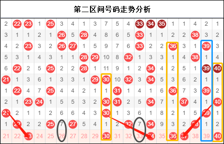 第一区间热转冷,开出四个号码。不过07 08出现倒是比较及时,为下一期的出号做了铺垫。接下来整个一区上走势俨然形成,只是不知道在当前区间比周期再一次回归的时候,一区能不能在转冷的走势下出现反转。但这丝毫不影响我们对胆码的追求,个别号码的筛选还是比较稳妥的。
