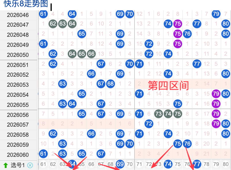 上期四区间开出了4个奖号(61.63.65.67)上期的四区开4个奖号呈现了一个递减趋势,开出的奖号7头断号,6头回补4个,先来看号码64在近 30 期内属于还是很稳定的号码,近期出现频率相对较温热,偶尔会间隔多期后出现一次,这个号码要注意防守,号码69具有一定的间歇性近期活跃度还是很稳定比如有时会间隔3到5期就再次出现,也有时会间隔多期,近期整体出现频率比较热,近期还是要关注的.号码74活跃度近期比较好,有一定的间歇性。活跃度近期较稳定,整体走势有一定的波动性.