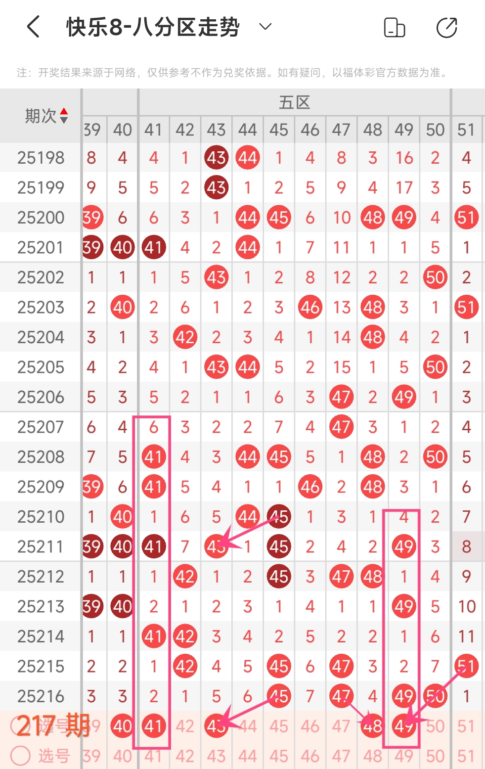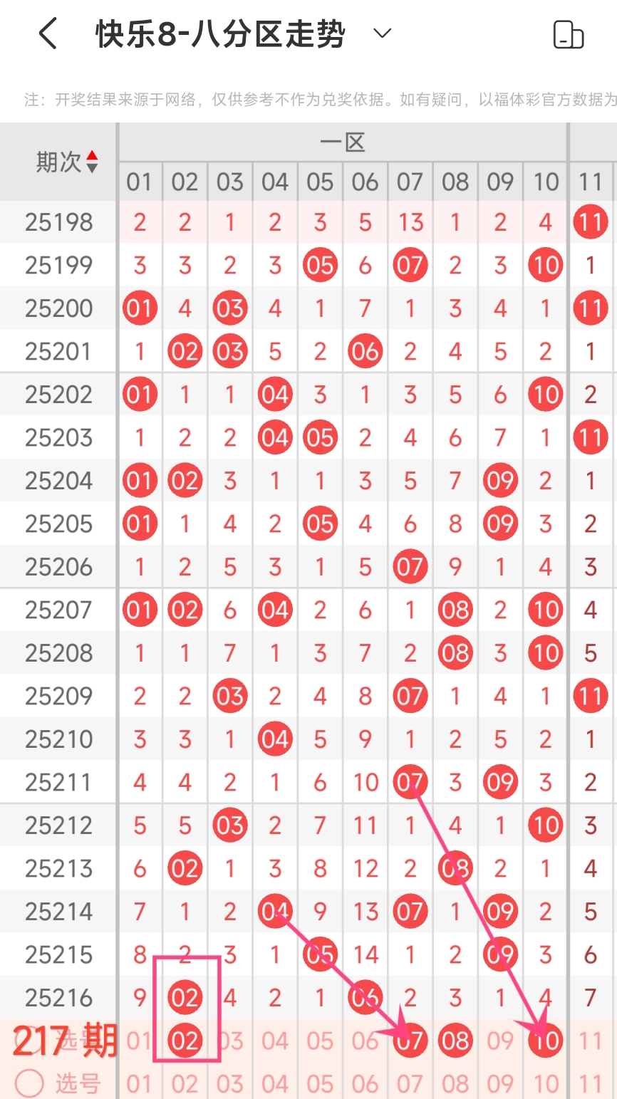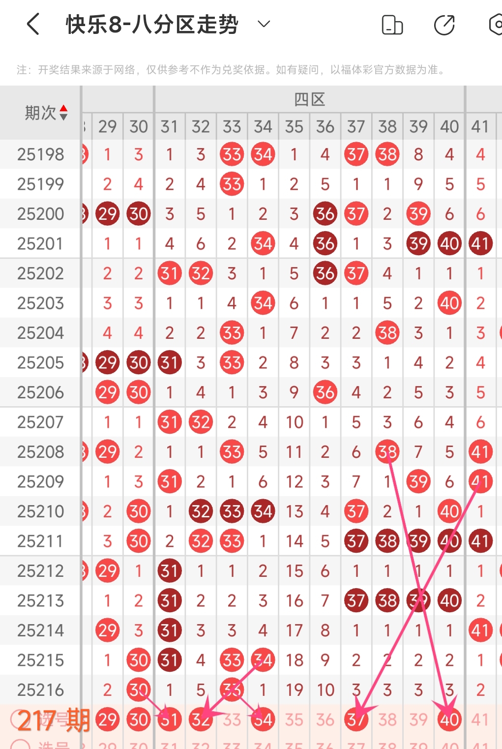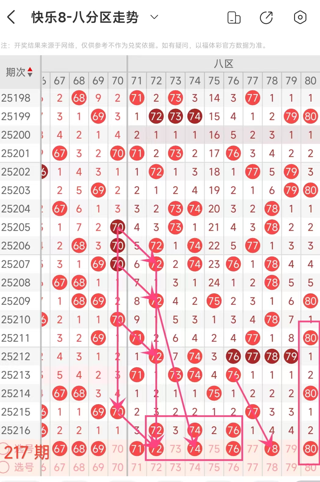 在快乐8的探索之旅中,通过对开奖走势图细致入微的观察,我们总结出一些具有参考价值的规律。几乎每一期开奖号码都呈现出以下显著特征:其一,大概率出现连号;其二,常常伴有边码;其三,遗漏值为1 2 3的号码频繁现身;其四,重号现象也较为常见。掌握这些要点,能为我们的投注提供方向指引。我们约定采用八分区走势图来展开分析。