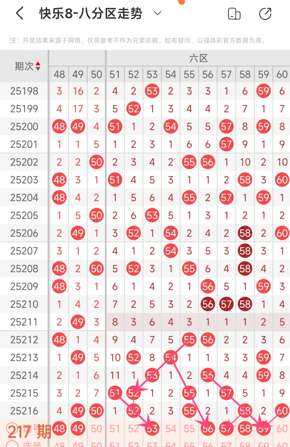 上期六区开出52 55 58 60这4个号码,本期应该出3个。