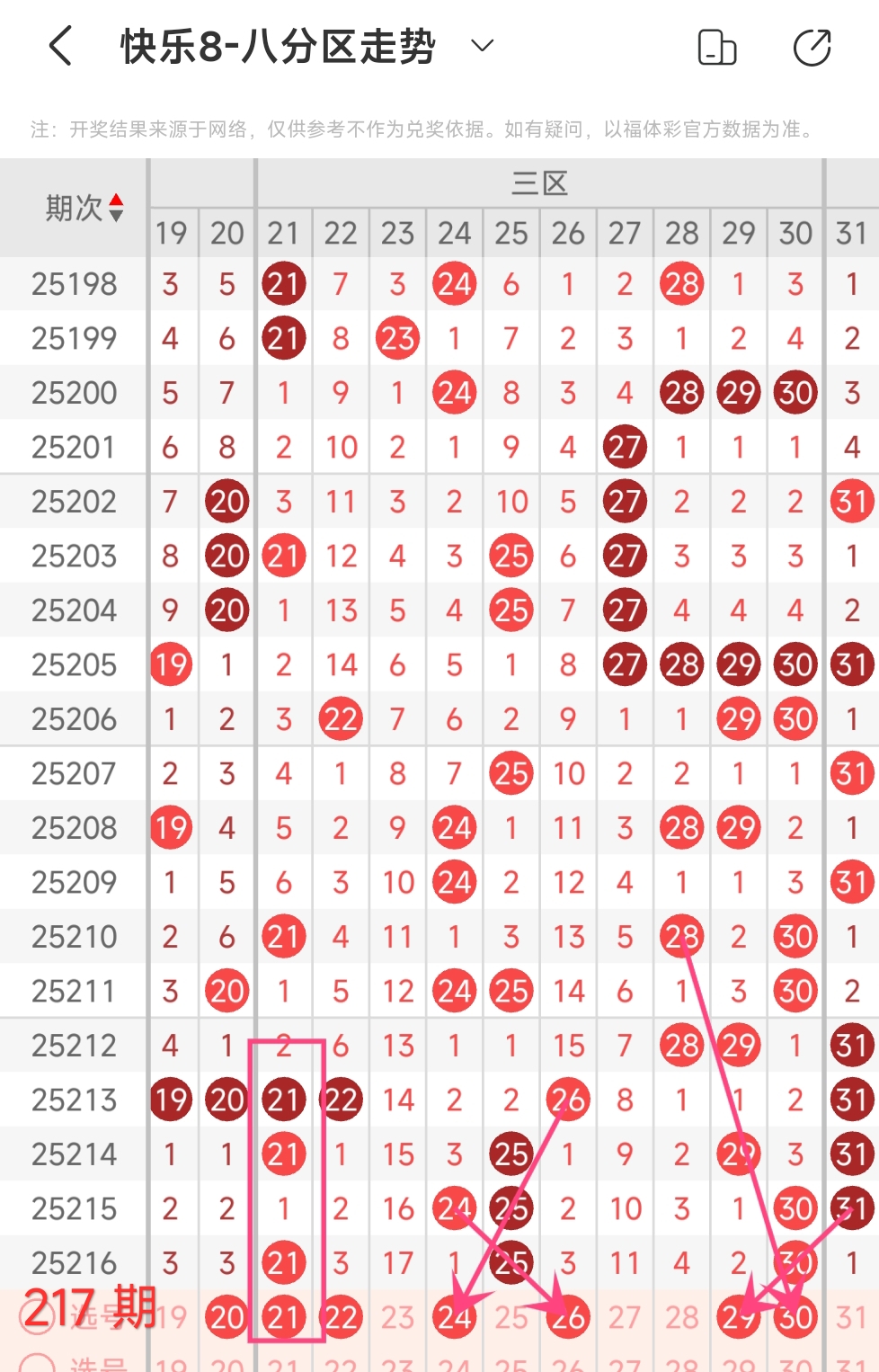 上期三区开出21 25 30 这3个号码,本期考虑3个。