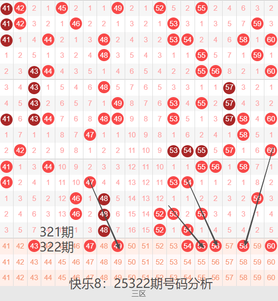 上期该区间开出号码:48 52 54,3个号码球,区间呈现冷开,区间整体上目前是在热开的周期,号码出号近期也比较平均,分布相对与其他大区间来说很均衡,本期二区间个人预选号码:43 47 49 54 55 56 58 60,43号是遗漏7期的号码,47号是遗漏3期的状态,49号是均线三斜连落位点,遗漏7期状态,54号本期看重码的机会,55号是遗漏1期的号码,三斜连落位走势,56号是遗漏4期的号码,均线三斜连落位走势,58号也是遗漏4期的号码,均线三斜连落位走势,60号是遗漏5期大号奥马,通过以上分析,三区间终选号码:49 54 55 56 58。