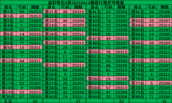 截至2025314期最大遗漏的号码是14期的71号,提取最近14期的数据做为2025315期的参考数据: