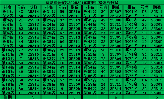最后再把号码分为四区:一区01-20号、二区21-40号、三区41-60号、四区61-80号,理论上每个区每期应该开出5个号码: