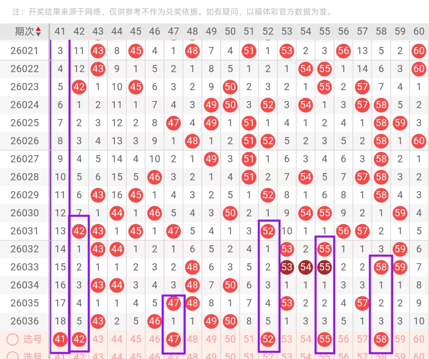 三区41-60:三区间,上一期回补了4个号码的下落,从近期三区间号码下落点位来看,一直处于温区状态,今天我们要重点关注的是三区间对子下面的回补和大于6的下落点位,在4头,首先我们要重点关注的是41-42的下落点位和对子空1-41-47-48的下落点位,今天这里可用41-47和42-48的搭配回补,回到五头位置,今天这里我们要重点关注的是52-54的下落点位和55-58的下落点位。今天这里可用52-58的搭配和54-59的搭配回补,这里值得我们重点关注的是开出2-5-8的可能。