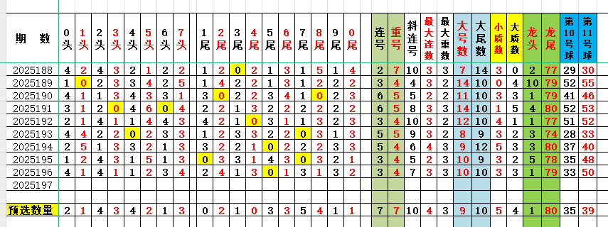 4、大号(41以上)数量:上期大号数量是 10 个,判断本期大号数量号码为 8 个;以小号码居多,要多考虑些;