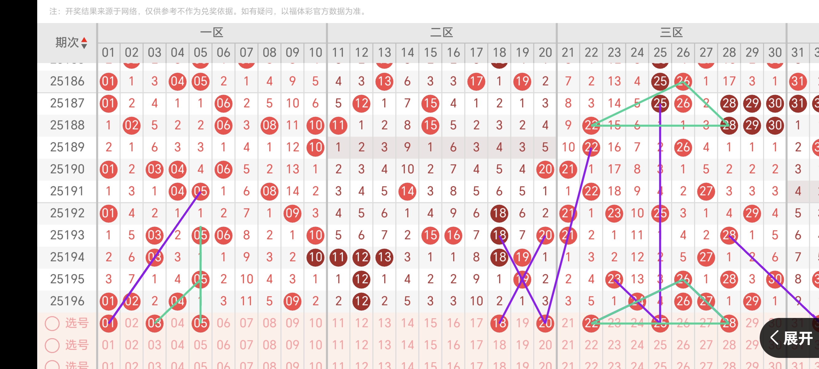 二、结合上面的数据及0头~7头前面几期出现的数量、1~10尾(0尾)出现的数量,以及一起彩APP走势图进行综合分析并选择20个号码如下: