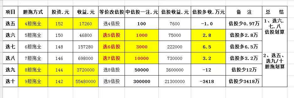 温馨提示一些投注技巧:由下面的统计表来对比选五至选十的各种倍投与N胆全拖的投注方式的性价比,说明哪些投注适宜倍投方式,哪些投注适宜N胆全拖方式,这些投注方式使用同样的资金,因投注方式不一样,最后的奖金却出入很大。