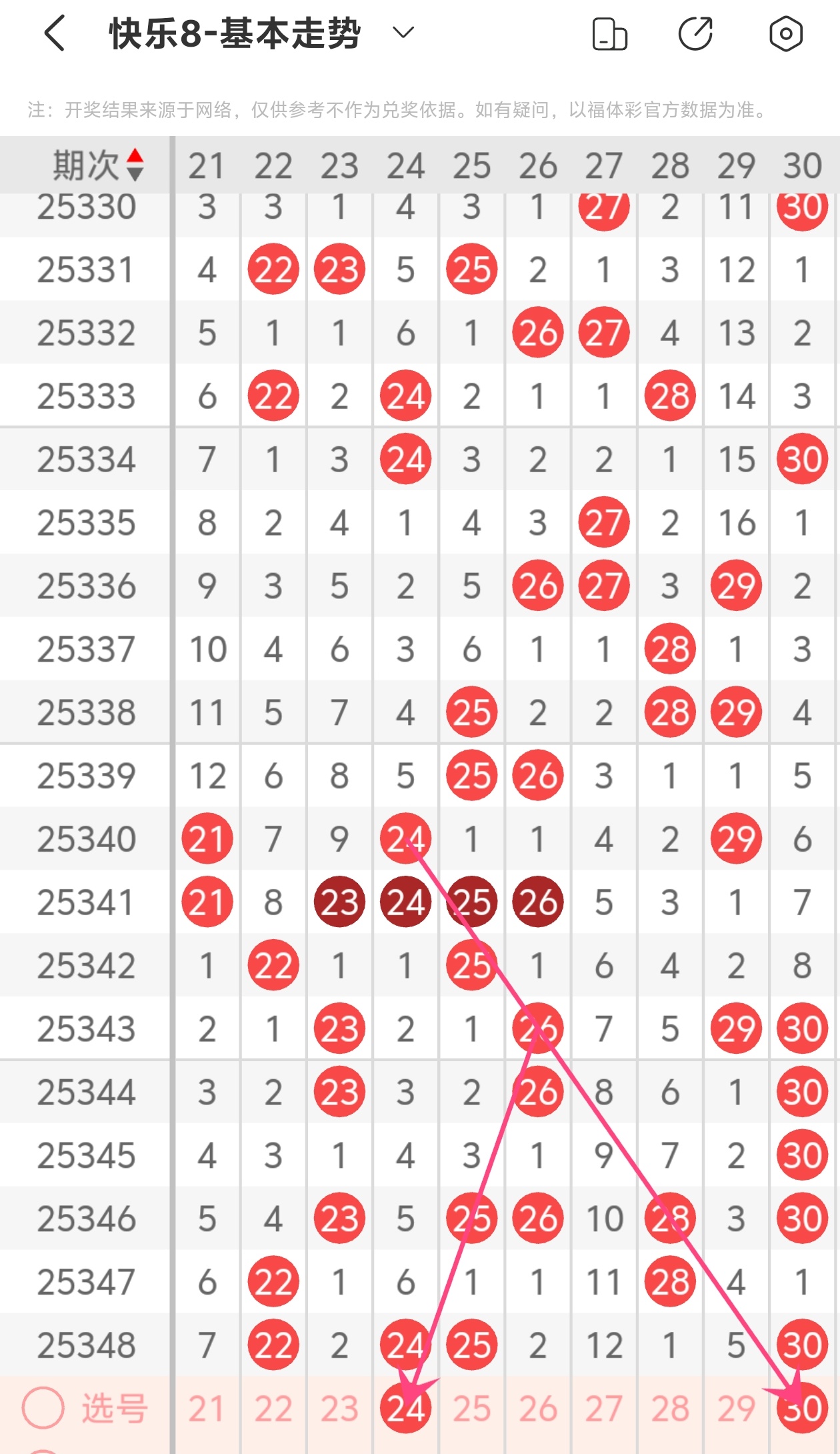 上期第三区间开出22 24 25 30,24为斜连走势,30为斜连走势,,本期推荐24
