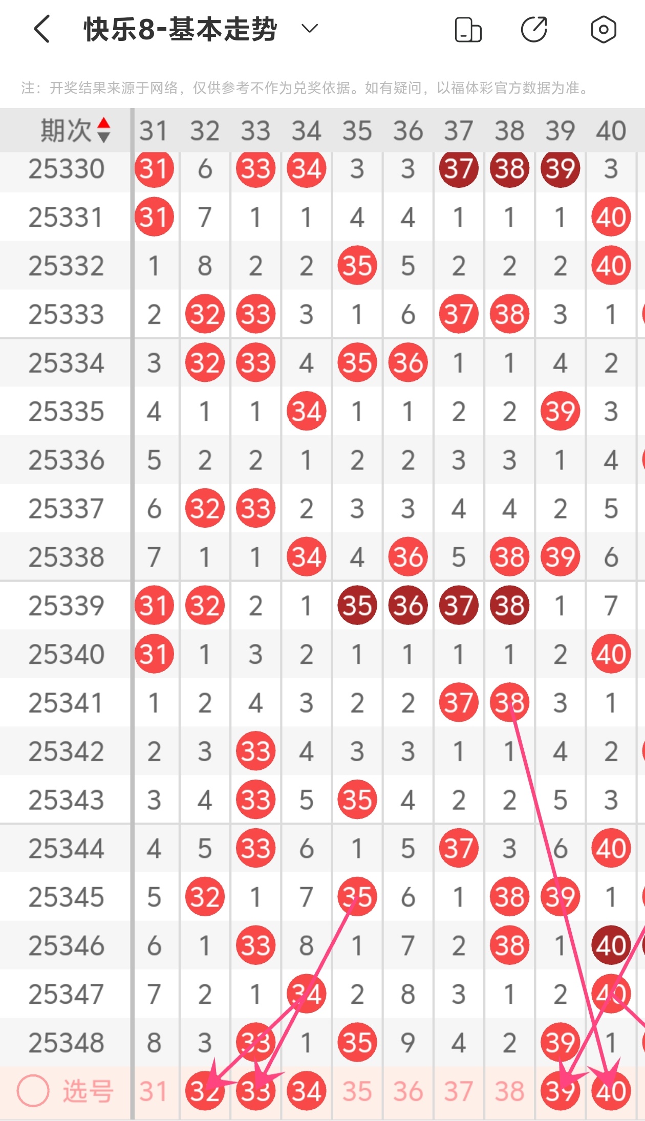 上期第四区间开出33 35 39,32为斜连走势,33为斜连走势,39为斜连走势,40为斜连走势,本期推荐32 33 40