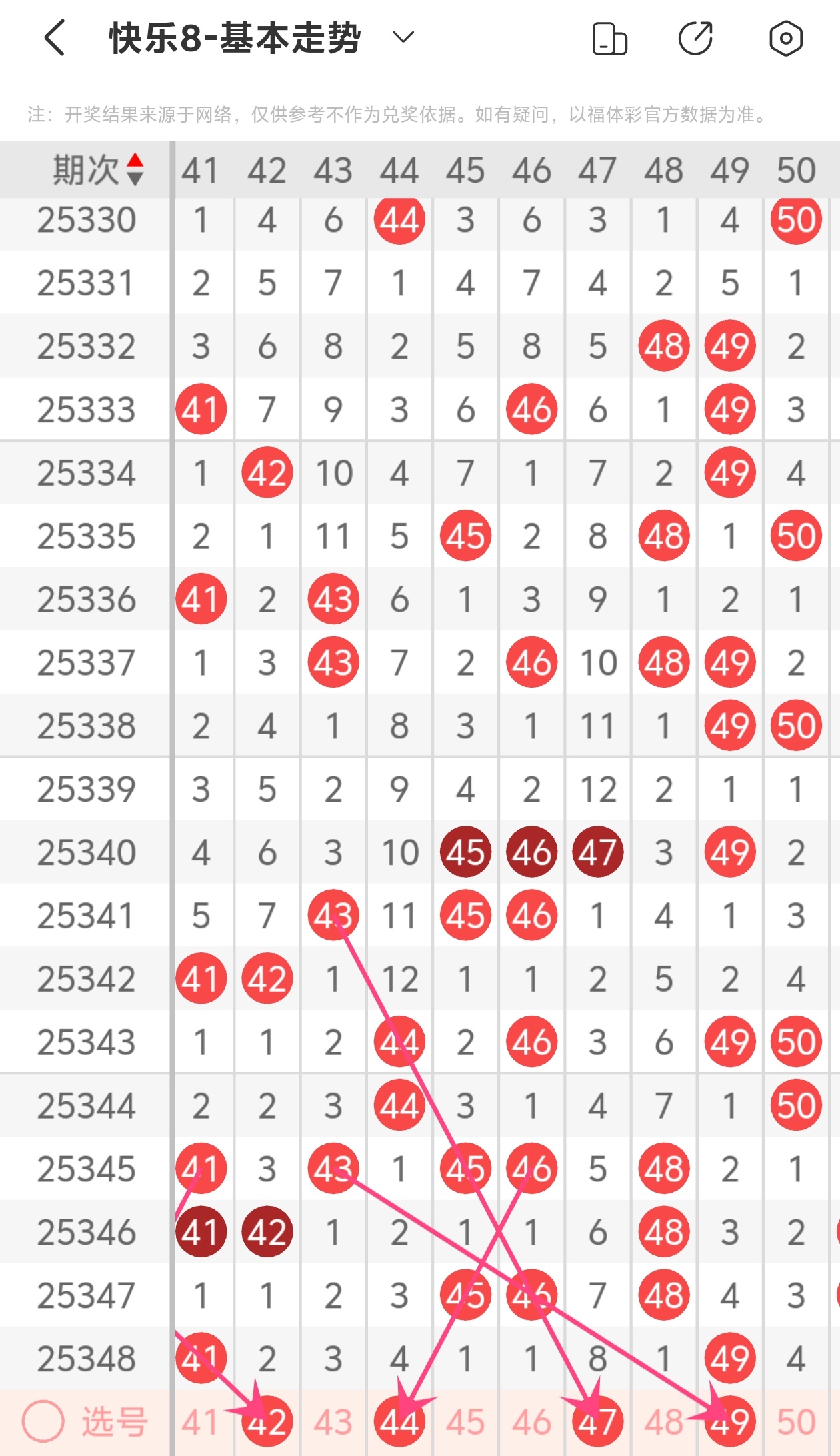 上期第五区间开出41 49,42为斜连走势,44为斜连走势,47为斜连走势,49为斜连走势,本期推荐42 44 47