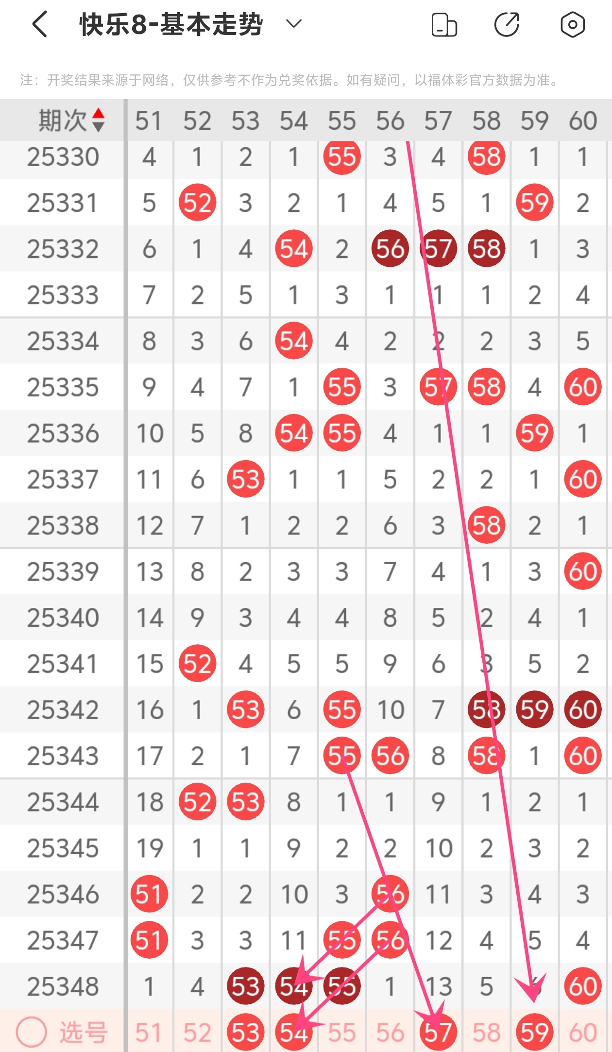 上期第六区间开出53 54 55 60,54为斜连走势,57为斜连走势,59为斜连走势,本期推荐54 57 59