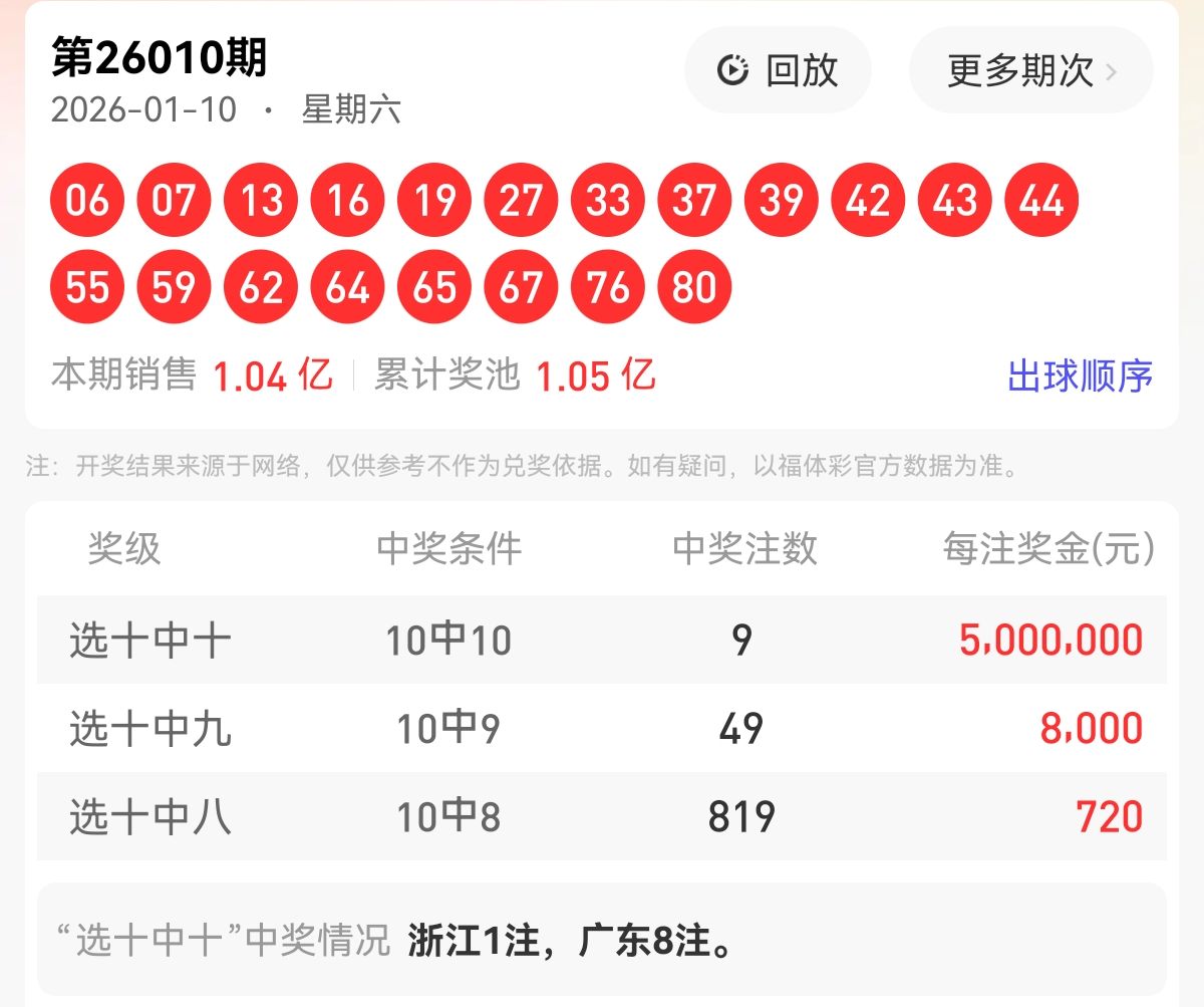 上期福彩快乐8第 2026010期开奖号码为【06 07 13 16 19 27 33 37 39 42 43 44 55 59 62 64 65 67 76 80】,其中大小比11:9,奇偶比为12:8,和值为854,跨度74,四区间比为5:4:5:6。下面是对本期对于每个号码的详细分析。