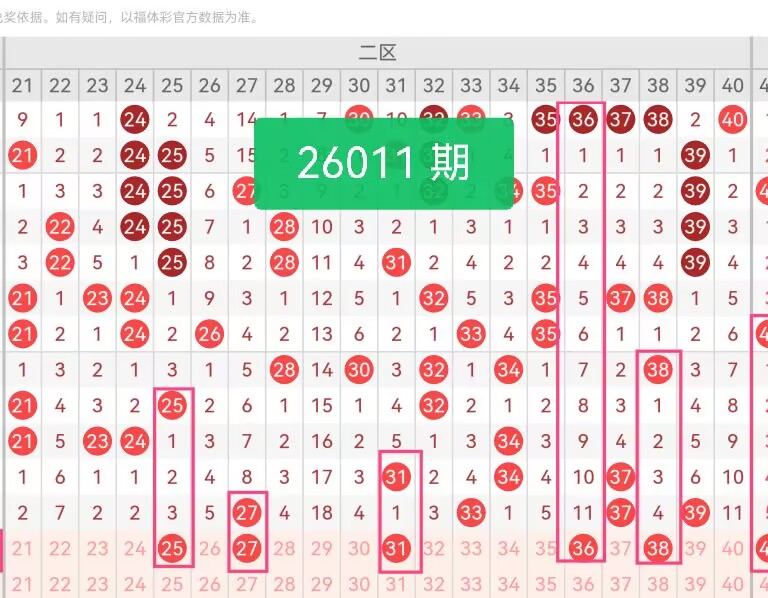 上期第二区间开奖4个号码,本期可能会增加开出。27是近期回补较强,在010期开奖中现身,走势强劲,具备延续性;25、31属于1路热出预期号码,契合本期1路号码活跃的走势判断;36为0路号码,符合本期0路号码热出能丰富号码路数结构;38是2路号码中的潜力股,与区间内其他号码在路数、奇偶上形成合理搭配,降低号码同质化。