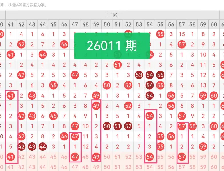第三区间号码推荐:【41 47 49 54 57】