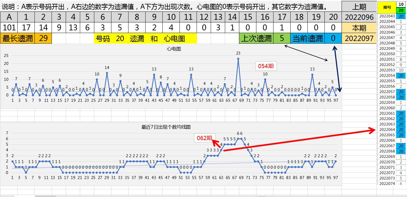 下方曲线为7日号码出现个数曲线图。可以很明显的看出,曲线中间偏右端有一段明显的上升曲线,从0到到6。曲线上升,表明号码个数越开越多,在7日内号码开出频率高。当我们在4点定格,即是2022062期,已经可以很确定这是一波上升走势,未来向上多开趋势非常明显,那么从063期开始就可以判断号码20在未来几期内会高频多开。事实也确实如此。