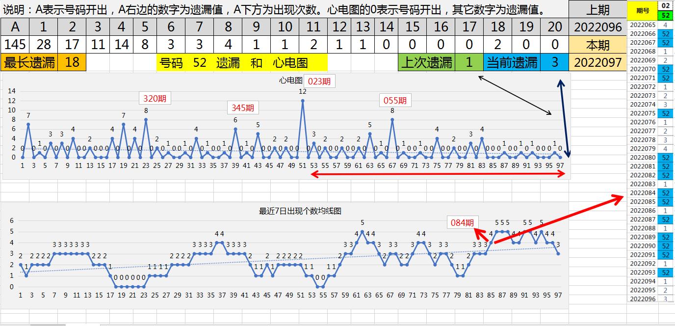 号码54在第2022084期,曲线定格在4点,上升方向也非常明显,之后由4升5,后来更是在高位徘徊,也显示着号码52的一波热开行情。