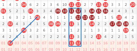 【第一区间01-20】:上期开出2个号码,区间出号和这个冬天一样寒冷。本期分析继续保持冷态,推荐号码02-11-12。02偶数三斜连,11-12为上下对称常见对子出号形态,并且02和12以区间同尾号码考虑。一区间推荐重点号码:02-12。