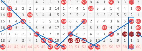 【第三区间41-60】:这个区间上期开出5个号码。本期推荐号码:47-48-49-53-54-59,47-48-49为近10期三连号频繁出号的重点防守,53同路走势,54则是遗漏10期形态号码,两者组成对子在5字头回补,59遗漏一三期形态。三区间推荐重点号码:47-48-59。