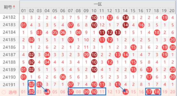 上期开出了连号02 03号数字,本期我们注意一下出一个重号的情况,重点关注一下02号数字的出号情况。本期的04 14 24号数字我们要注意出号情况,重点关注一下04 14号数字出一个号码的情况。上期开出了07 10 11 13号数字,那么本期我们是要做重的,重号重点关注一下07 10号数字出重的情况就行了。本期的08 09号数字我们也是要注意出一个号码的情况,可以重点关注一下09号数字的出号情况。本期的17 18号数字我们注意出一个号码的情况。