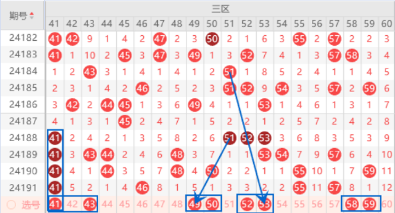 本期的41号数字我们防守一下出现5重号的情况,如果本期的41出来,那么43号数字出号的机会就很大,我们要注意一下。本期的49号数字我们关注一下出号情况,这里可以防守一下49 50号数字同出的情况。本期的阶梯号码51 52 53 54号数字本期是要注意落下两个号码的情况,重点关注一下52 53号数字同落的情况。本期的58 59号数字我们可以做一下,尤其是本期的58号数字出号机会很大。