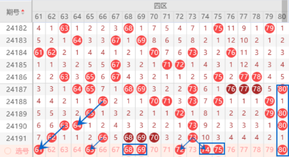 本期的61号数字我们注意一下出号情况,属于三斜连号码对应,出号机会是很大的。本期的65号数字我们也是可以关注一下,出号机会是很大的。上期开出了66 68 69 70号数字,那么本期我们是要做重号,重点关注一下68 69号数字出一个号码的情况。上期开出了73号数字的重号,本期我们注意一下走分边的情况,重点关注一下74号数字出号情况。本期的75号数字我们也是要重点关注一下出号情况的。