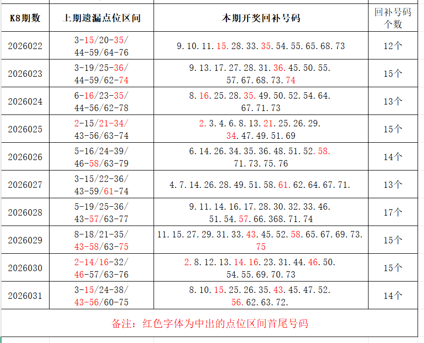 如图,上期的遗漏号码在下期开出10个左右,即为回补号码。定准点位区间首尾号码是关键!以上期2026031期为例,定位4个遗漏区间,围中14码!结合上期开奖号码,以跨度值大于或等于7为依据,本期关注5个遗漏区间:1-8/15-22/26-35/35-42/63-72;重点关注遗漏区间:4-16/23-36/44-58/63-79。点位区间号码和大底号码请勿混淆,个人分析,仅供参考。