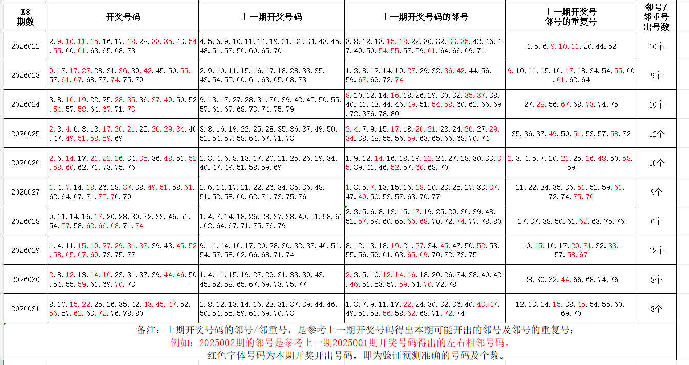 如图,红色字体是上期邻号、邻重号在下期开出,每期开出10个左右。上期邻号开出6个,邻重号开出2个本期参考邻号:7.11.14.16.21.23.24.27.34.36.41.48.51.53.55.58.61.64.71.73.75;邻重号:9.42.43.44.46.56.57.62.63.77.79;个人分析,仅供参考。