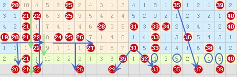 19 20 21 22号这个四连号在前两期中都落号了,所以本期也是比较看好它落号下来的,本期连号同时遗漏2期的有3组,分别为19 20号和24 25 26号及77 78号数字,应该是有一组连号是要断号不会落号的,有点不好判断,所以这里的19 20号我们做防守就可以了。22号数字属于重号对称类型,可以关注一下。26号数字既是24 25 26号这个连号的落号又以27 28号形成3斜连,可以重点参考一下。上图中30 31 32号这种虎口类型号码组合也是容易出3斜连或者重号的了。在上期开出的号码中这种类型的有两组,另一组为46 47 48号数字,所以在29 30 31 32 33号和45 46 47 48 49号数字中最少有2个号码是要开出的,我们主要还是参考29 33 45 46 49号数字。在32号到40号数字之间有两组同期遗漏值,分别为33 38号和35 39号数字,该区间出号应该是在这几个号码中出,可以重点参考33 39号数字。