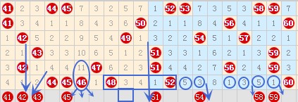 上期开出的空三类型只有48 52号这一组,而且在上期中空三类型的中心号已经开出来了,所以本期空三中心号50号数字我们就不考虑了,我们可以参考它的邻号49 51号数字选一胆码。在来看52 60号数字区间有三组同期遗漏值为53 58号和54 56 59号及57 59号数字,这些数字预测本期应该是要开出两个号码的,可以重点作防一下。