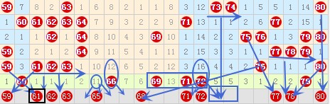 上期的61 62 63号这个连号没落号,本期很看好它要落号下来的,59 61号数字又是以60号为中心对称的类型,这种也是很容易落号的了,及根据前面的分析,我们可以在59 61号数字中定一个毒胆出来的。上期开出了66号这个冷号,又是一个孤号,所以本期它的重号和邻号我们也是要重点关注的,可以重点参考下65号数字。上图中的69 71 72号这种连号空一带号的类型组合号码没落号下来,所以本期肯定是要落号下来的。上期开了2组这种类型的号码组合分别为44 45 46 48号和69 71 72号。这里面本期是要有重号开出来的,重点参考45 46 71 72号出重号,可以在这个号码里定一胆码的。73 74号这个两连号已经同时遗漏5期了,本期可以关注一下73号数字,因为它是上期开出的冷号72号数字的邻号,我们可以防守一下。77 78号数数字前面已经说过了,不确定是否在这里断号,所以这里做一下防守就行了。好了,本期分析就到这里了。