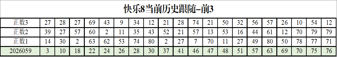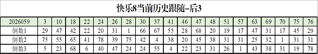 我感觉选热的同时,还要注意防冷条件开出,可以直接选取每个号码跟随出次前三的号码,也可以考虑把出次最后的三个数字加进去,不过这样可能号码太多,可以尝试。图上也能看出单独号码跟随的情况,我就不一一统计每个号码的出次了,我这里考虑提高概率,取每个号码历史跟随的前三号码和后三号码,根据2026059期的号码,我关注正数3和倒数3的号码号码为: