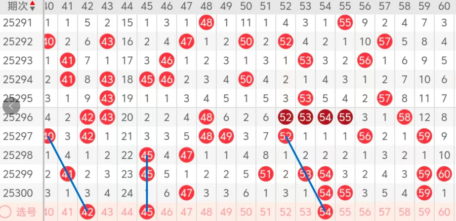 第三区间的走势分析:第三区间上期开出了四个号码球,主要的落号点位在三区间的后半区,走出了三奇一偶的形态,三区间上期前半区只落下一个号码球,后半区落下了两重码带一边码的形态走势,整体处于温态趋势,根据这一走势规律,今天的三区间我们重点关注前半区号码的落位,首先关注42这个号码球,走出了斜连码的形态,再看45这个号码球两重码隔期回补的的形态,也走出了对称的形态走势,最后关注54这个号码球的重码,形态走势与42一样,重点关注42 54组合的落位,建议大家打个三码复二,参考为主!