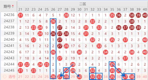本期的26号数字我们注意一下出号情况,上期的24 25号数字中的25号数字没能开出重号,有点可惜,但是也不影响本期的26号数字出号,本期的26号数字是属于123走势,出号机会还是有的。上期开出了28 29 32 35 36号数字,本期这里我们要注意出重的情况,其中我们注意出一个三重号的情况,三重可以关注一下35号数字的出号情况,重号我们可以关注一下28 32号数字出重的情况。