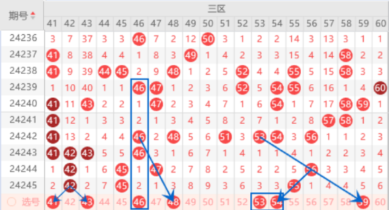 上期的42号数字开出三重号,本期我们注意一下走分边的情况,本期的41 43号数字的走势都是比较好的,可以防守一下同出的情况,稳一点的话,就做一个号码就行了,可以重点关注一下41号数字的出号情况。本期的51 53 54号数字我们要注意落号情况了,属于连号空一带号,已经遗漏3期了,本期最少是要出一个号码的,我们重点关注一下53 54号数字的落号情况。