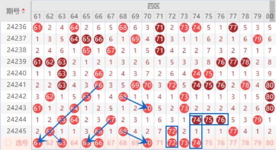 该区间的61号数字我们注意一下出号情况,本期的61号数字是属于斜6连号,应该是要连到头了,本期出号机会是有的,这里可以防守一下61 63号数字同出的情况。三连号74 75 76号数字上期没能开出重号来,本期我们注意一下落下一个号码的情况,重点关注一下74 76号数字的出号情况,其中的74号数字可以重点关注一下,如果本期的76号数字不出,那么本期的27号数字我们就要重点关注一下,这里可以关注一下。
