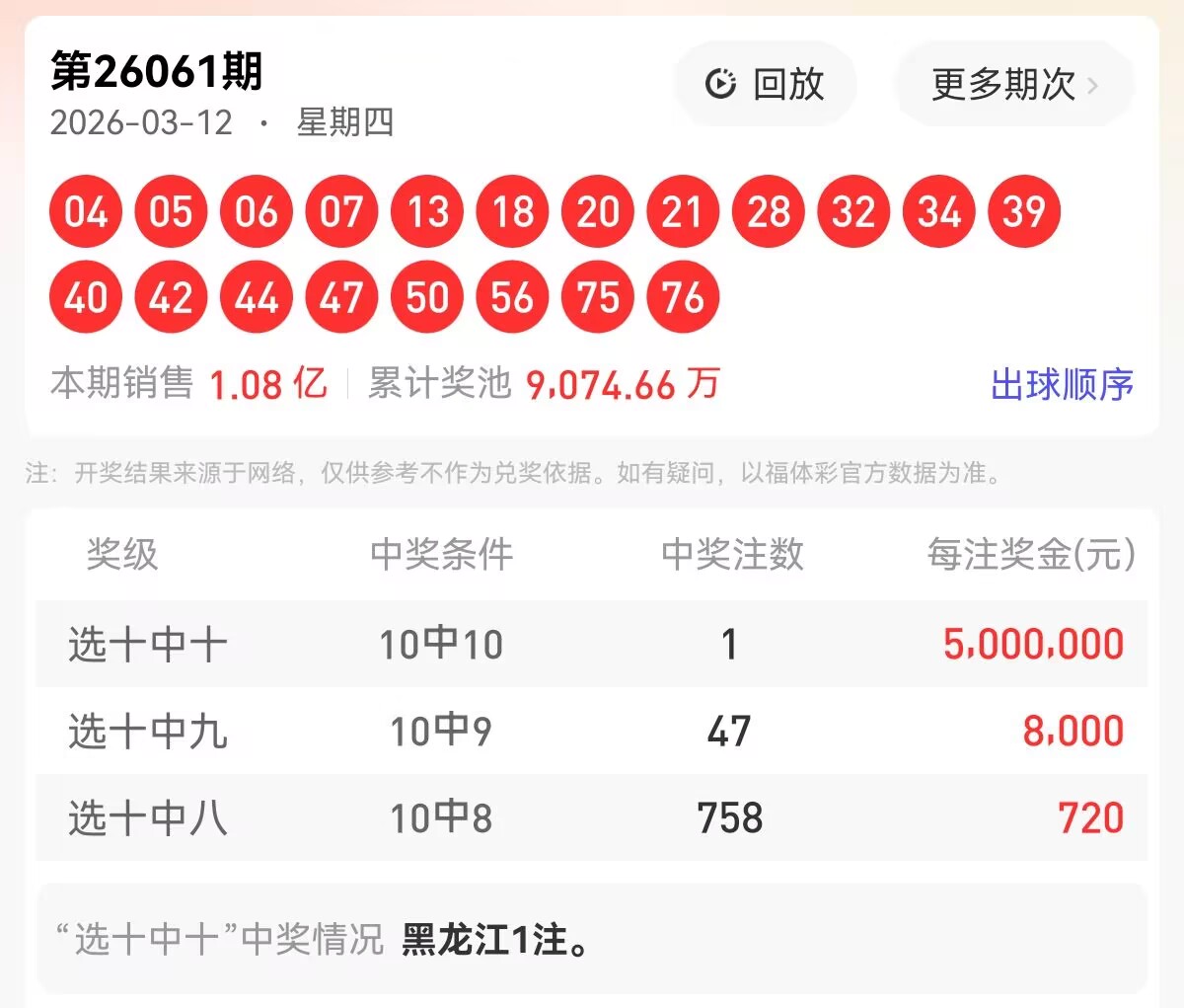 上期福彩快乐8第 2026061期开奖号码为【04 05 06 07 13 18 20 21 28 32 34 39 40 42 44 47 50 56 75 76】,其中大小比7:13,奇偶比为7:13,和值为657,跨度72,四区间比为7:6:5:2。下面是对本期对于每个号码的详细分析。