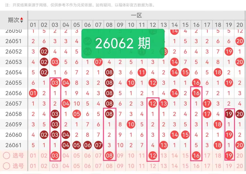 上期第一区间开奖7个号码,本期可能会减少开出。03作为一区前端的过渡性小号,位置偏前且走势平稳,能填补一区前段可能出现的号码空缺;08处于一区中段,奇偶属性均衡,都能自然融入组合,提升搭配容错率;12进一步巩固一区中段的号码密度,让区间内号码分布更匀称,避免出现区间内的分布断层;16与一区尾段形成呼应,同时具备一定的邻号组合潜力,能丰富一区的组合形态;19作为一区尾号,守住区间末端的防守位,避免一区尾部出现号码空缺。