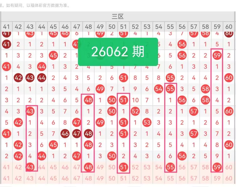 上期第三区间开奖5个号码,本期可能会增加开出。43衔接上期三区的42、44号,形成自然的邻号过渡,延续了三区前段的出号连贯性,让区间整体走势不脱节;48处于三区中段,位置居中且尾数规整,无论是与前段的43组合,还是向后衔接中段、后段号码,都能快速融入;51作为三区中段的过渡号,承上启下的作用显著,让三区41-60的区间分布更均匀,避免出现中段号码稀疏的情况;55关联上期三区的56号,具备邻号联动属性,能丰富三区的组合变化,避免组合形态过于单一;59作为三区尾号,守住区间末端,与前段号码形成呼应,完整覆盖三区41-60的全区间。