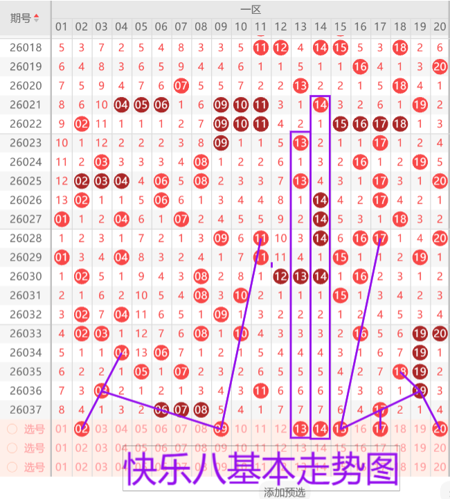 我们先来看下一区的基本走势情况,上期开出了四枚开奖号码,本期预计开出4-5枚开奖号码,首先我们来看02的三斜连龙头走势。06 07 08的三连号开出根据最近的三连号走势下面不考虑重号优先考虑分边的05 09二选一,推荐09的双线三斜连走势。 12 13 14三连号回补形态,优先考虑13 14的147遗漏回补一枚。15的双线三斜连,一区重号重点考虑17。20的收尾遗漏四形态。