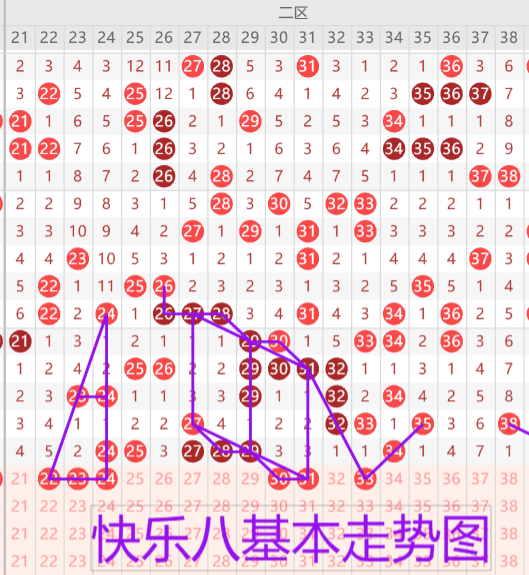 我们来看下二区的基本走势情况,上期开出了七枚开奖号码,本期预计开出4-5枚开奖号码,首先我们来看22 23 24的三角形走势形态建议考虑一到二码。30 31的上下对称二连走势形态(如图所示)。33的三斜连号码。33-40位置建议考虑在防空一起或者36 37回补一枚号码。