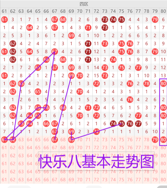 我们来看下四区的基本走势及情况,上期开出了三枚开奖号码,本期预计开出4-5枚开奖号码,首先我们来看同形态的三斜连空一只想号码的61 62二连走势建议二选一。67 69重号建议二选一。独十遗漏的79终点防守。 80的空二对称走势形态。
