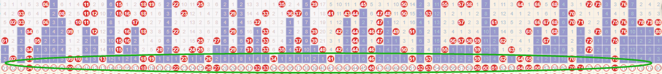 重号防守做好之后,剩下的重点就是要去决定断区了,在如此大的开奖断区之下,下一期一定会出现比较大的回补。那具体分布在04-09之间,26-34之间,34-41之间,41-46之间,46-51之间,53-59之间,65-70之间,70-75之间,75-80之间,最大的断区在8个号码,最小的断区是两个,而遗漏最多的区间是75-80之间。所以下一期断区选择重点放在75-80之间和26-34之间。在这两个区间可以大做文章即可。