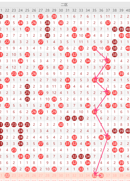 第二区间的走势分析:第二区间上期开出了6个号码球,前半区4个,后半区2个码,走出了51的形态走势,根据二区间的走势规律,今天的二区间我们主看半区33根据33的落球规律,重点关注2235组合