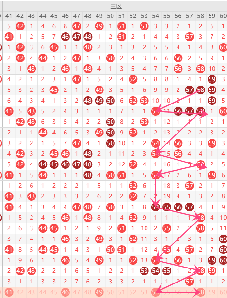 第三区间的走势分析:第三区间上期开出了1个号码球,属于前半区0个,后半区1个码。走出了1奇的形态走势,根据三区间的走势规律,今天的三区间我们主看半区位置57组合的落位,根据57的落球规律,重点关注4658组合这个号码球的落位