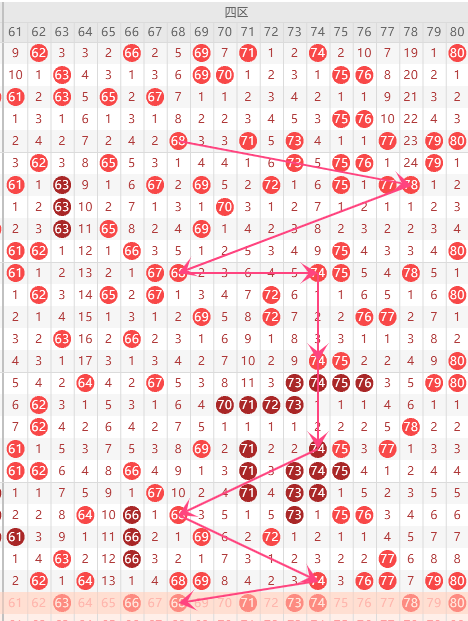 第四区间(61-80)第四区间的走势分析:第四区间上期开出了11个号码球,走出了36的形态走势,根据四区间的走势规律,今天的四区间我们主看半区74这个号码球的落位,根据68的落球规律。重点关注6874组合