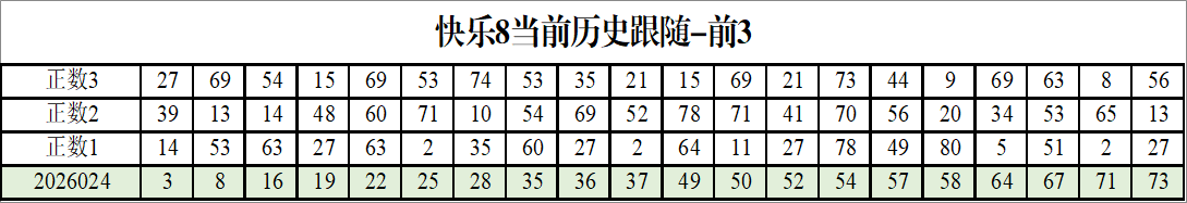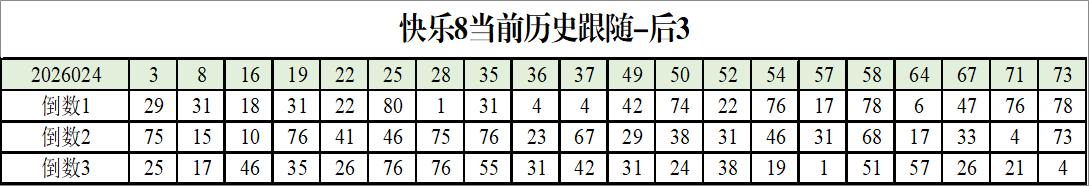 我感觉选热的同时,还要注意防冷条件开出,可以直接选取每个号码跟随出次前三的号码,也可以考虑把出次最后的三个数字加进去,不过这样可能号码太多,可以尝试。图上也能看出单独号码跟随的情况,我就不一一统计每个号码的出次了,我这里考虑提高概率,取每个号码历史跟随的前三号码和后三号码,根据2026024期的号码,我关注正数3和倒数3的号码号码为: