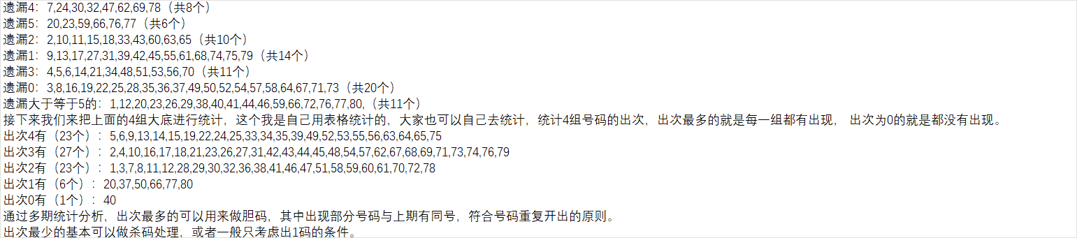 如果把对数和补数合起来有40个号码,中间可能还会产生一下重复数,通过近几期的统计分析,以上期数据进行补数对数计算推算下一期的概率不高。为提高概率,我主要是用前两期的数据来进行对数补数推算,然后再组成一个集合,作为我的第四组大底号码。