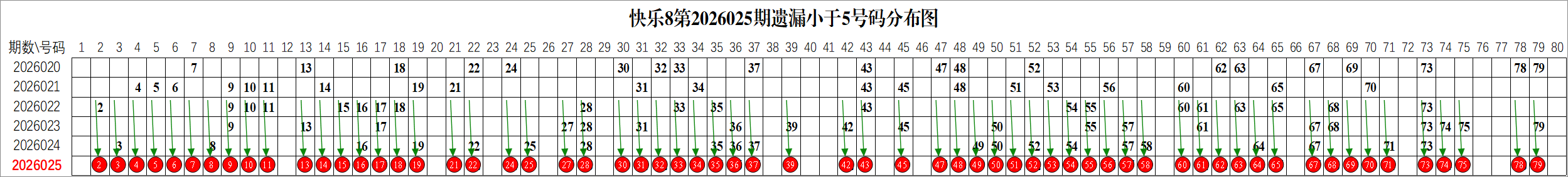 所以这个条件值得关注,从号码分布图上我们可以分析出,遗漏小于5期的号码有: